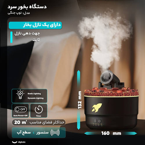 دستگاه بخور سرد توپ جنگی محصولی جمعوجور، کاربردی و دکوراتیو است که برای استفاده در اتاق کودک، اتاق خواب و فضاهای کوچک تا 20 مترمربع طراحی شده است. با ابعاد 132×132×160 میلیمتر و وزن سبک 700 گرم، به راحتی در هر محیطی قابل استفاده است و فضای زیادی اشغال نمیکند. مخزن دستگاه از پلاستیک ABS مقاوم ساخته شده و ظرفیت آن 0.2 لیتر است که امکان 8 ساعت کار مداوم را فراهم میکند. دستگاه دارای نازل ثابت بخار است و با فناوری بخور سرد، رطوبت هوا را بهصورت یکنواخت پخش میکند. این مدل با ویژگیهای پیشرفتهای مانند 6 رنگ نورپردازی RGB، تایمر قابل تنظیم، امکان افزودن اسانس معطر و دو حالت بخاردهی حلقهای و غبارپراکنی، تجربهای آرامشبخش و جذاب برای محیط ایجاد میکند. طراحی الهامگرفته از گدازه آتشفشانی و طبیعت، جلوهای دکوراتیو و مدرن به فضای شما میبخشد. استفاده از این رطوبتساز به بهبود کیفیت هوا، مبارزه با خشکی هوا و پخش رایحه مطبوع کمک میکند و در دو رنگ سفید و مشکی قابل خریداری است. دستگاه با آداپتور برق و دفترچه راهنما عرضه میشود و ترکیبی از زیبایی، کارایی و ایمنی را در محیط شما فراهم میکند.