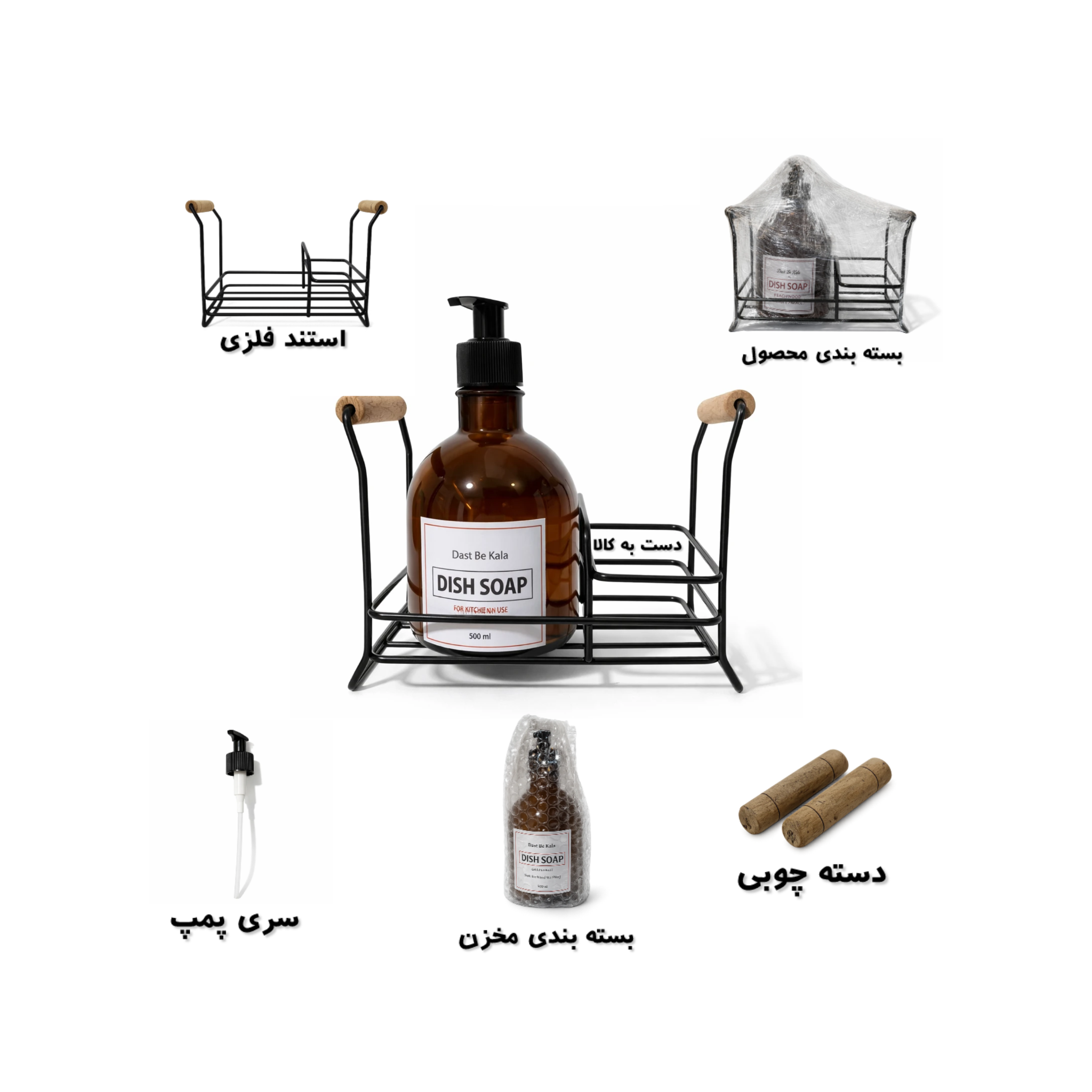 پمپهای فشاری با عملکرد روان، استفاده از مایع را آسان کرده و مصرف را کنترل میکنند. استند فلزی مشکی با طراحی مینیمال و دستههای چوبی کناری، جلوهای مدرن و گرم به فضای کنار سینک میبخشد و باعث میشود آشپزخانه همیشه مرتب و منظم دیده شود.