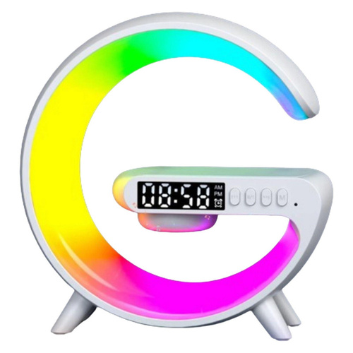 یک اسپیکر و FM جذاب با قابلیت شارژر وایرلس! این اسپیکر طرح G شکل 7 مدل رنگ چراغ دارد که نور طبیعی دارند و چشم های شما را اذیت نمی کنند. ساعت نمایش دیجیتالی رو صفحه این اسپیکر قابلیت تنظیم دارد و می توانید به عنوان آلارم نیز از آن استفاده کنید. این اسپیکر بلوتوثی است و قابلیت استفاده از اپلیکیشن خود را نیز دارد. مهم ترین قسمت این اسپکیر شارژ وایرلس آن است. هر چیزی اعم از موبایل، ایرپاد و ... که دارای وایرلس شارژ هستند می توانید در هنگام اتصال به برق از وایرلس آن نیز بهره مند شوید. در قسمت G شکل همانند عکس می توانید گوشی و ... خود را شارژ کنید.