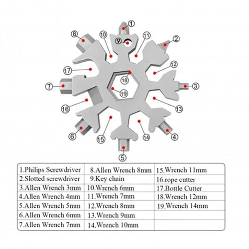 سایر توضیحاتاگر شما هم به داشتن ابزارآلات جالب و نوآورانه علاقمندید، ابزار یا همان آچار دانه برفی برای شماست. حتما در زندگی روزمره برای شما پیش آمده که برای باز کردن یک پیچ یا مهره سریعا نیاز به یک ابزار داشته باشید ولی آچار یا ابزار لازم برای آن در دسترس نباشد. داشتن این ابزار 18 کاره در این مواقع می تواند خیلی کار راه انداز باشد. آچار همه کاره دانه برفی شامل : آچار تخت (ششگوش) از شماره 7 تا 14، ابزار آلن از شماره 3 تا 9، پیچ گوشتی دو سو و چهار سو، درب بازکن و تیغ برای بازکردن پاکت و جعبه، درب باز کن شیشه نوشابه، چاقو برای بریدن نخ و طناب، آویز برای جاکلیدی